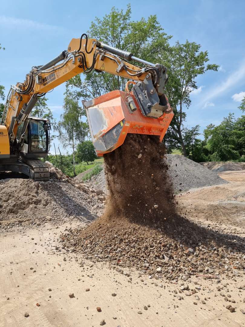 Zerkleinern von leichtbrüchigen Gesteinen im Bauschutt wie Bims, Ziegel, Poroton, bei gleichzeitigem Separieren der Brocken 0 - 60/80 mm, größere und harte Teile bleiben im Separator.