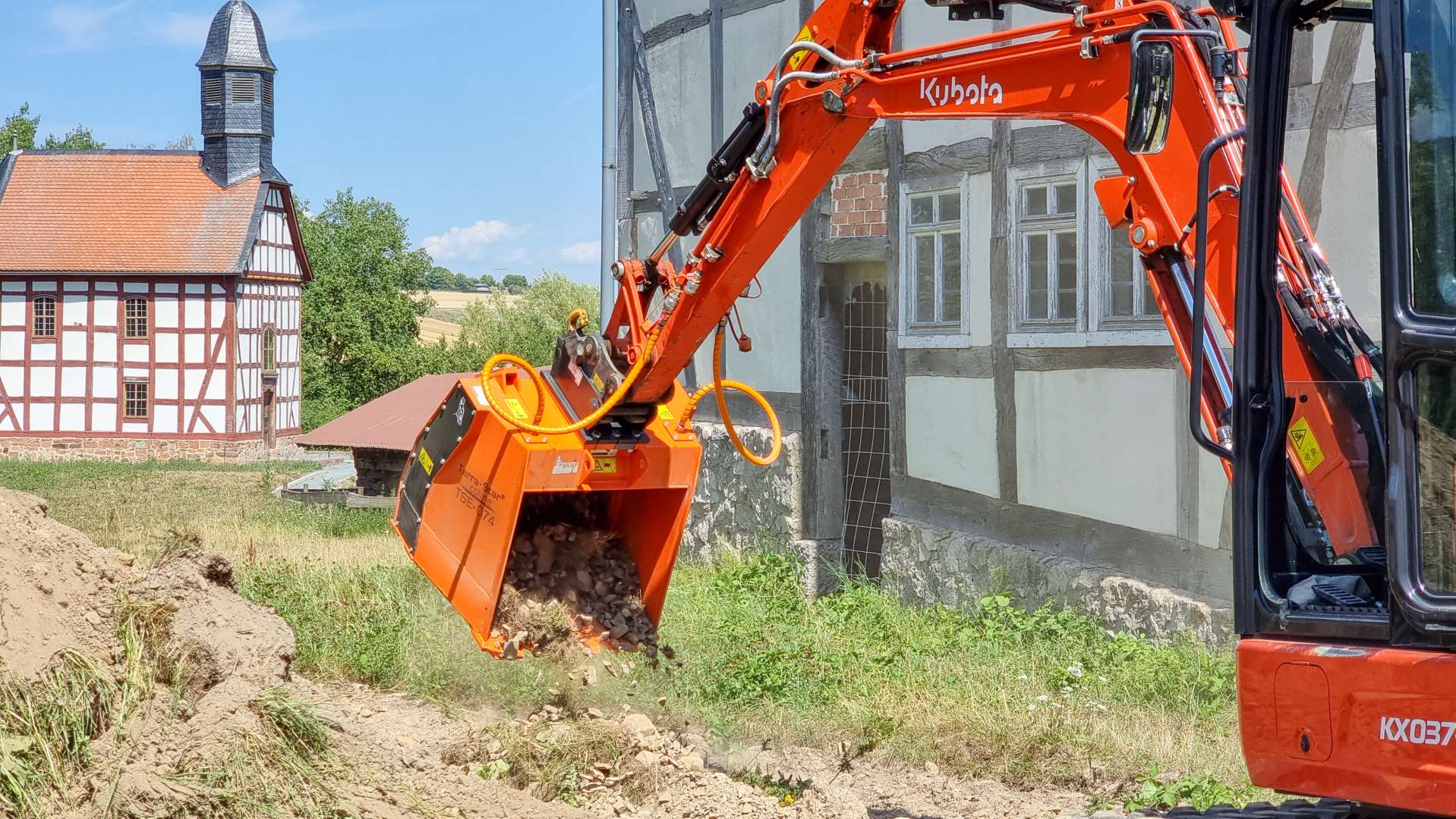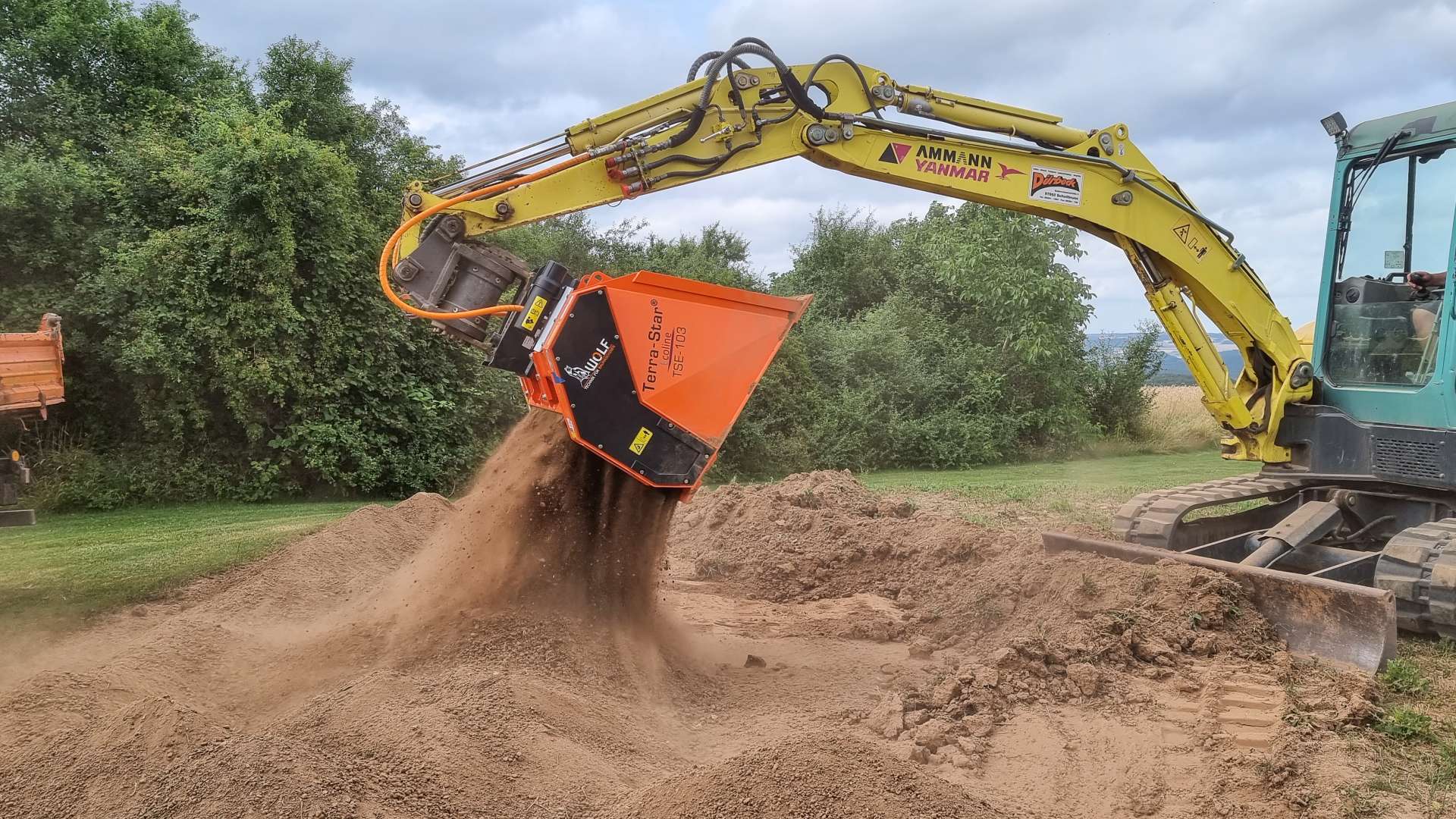 für den Bagger ab 1,4 Tonnen ausgelegt. Mit seinen 3 bzw. 4 Wellen eignet er sich herausragend zum Aussieben von Steinen oder Fremdstoffen und dem Trennen der Erde aus Grassoden und Wurzelwerk,